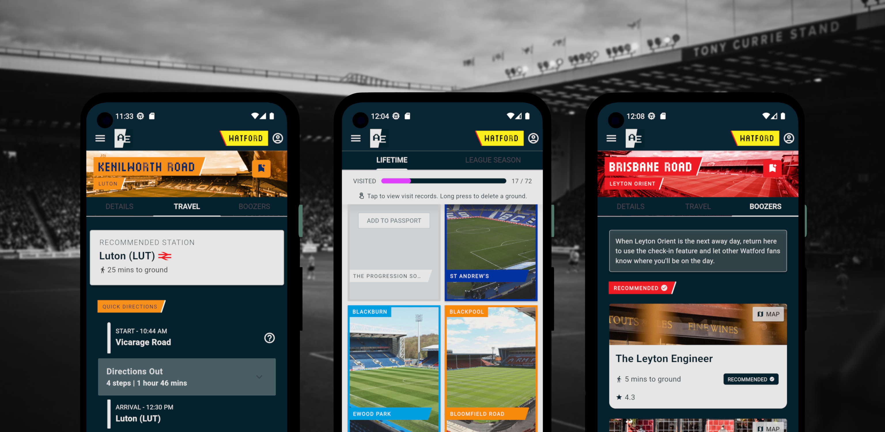 Less reading, more seeing. Browse the core screens that away fans use every week to get to the ground on time, stay together, and tick off every stadium.